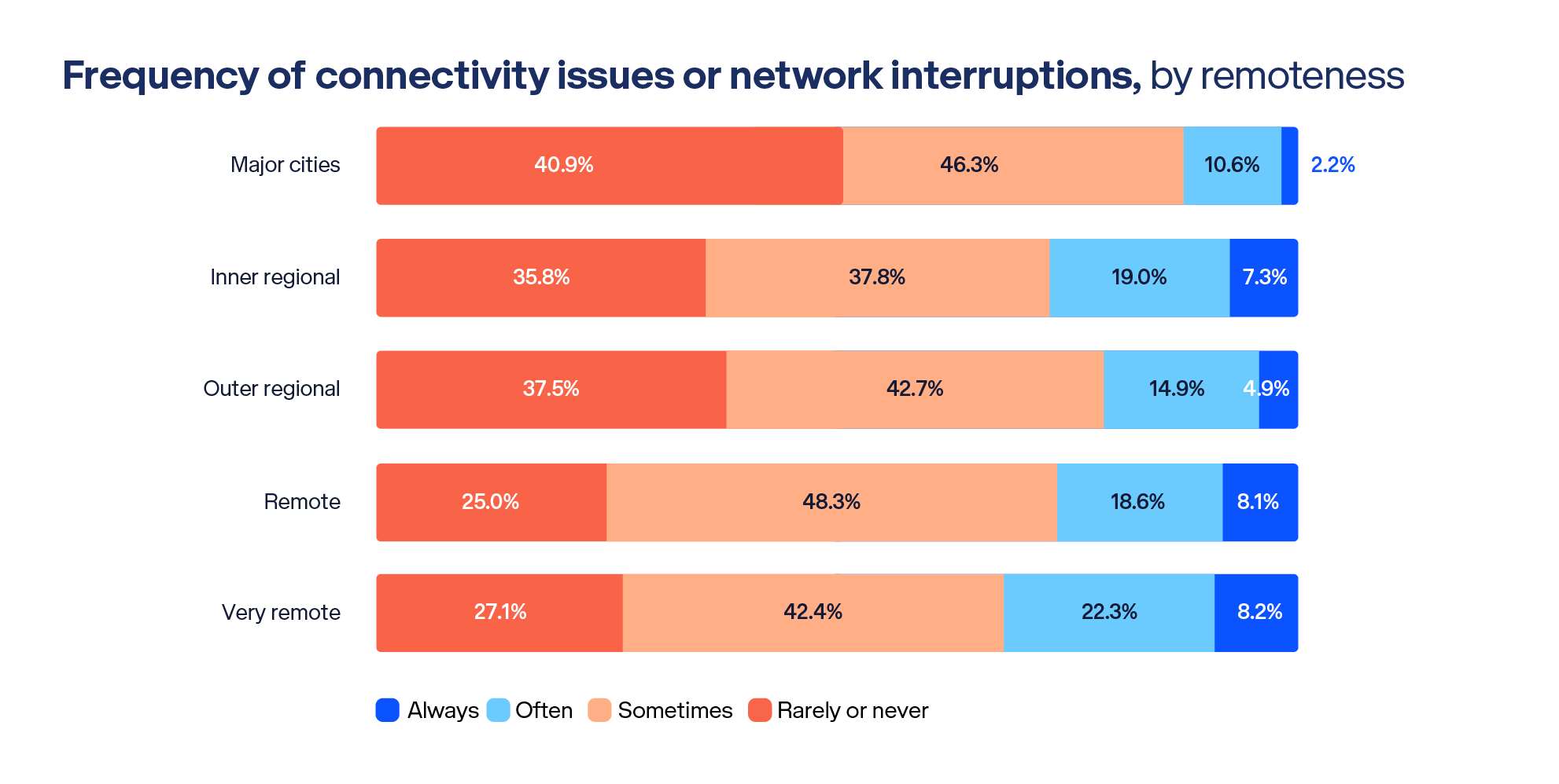 Figure 1: Frequency of connectivity issues or network interruptions, by remoteness (Source: Australian Internet Usage Survey, 2024).